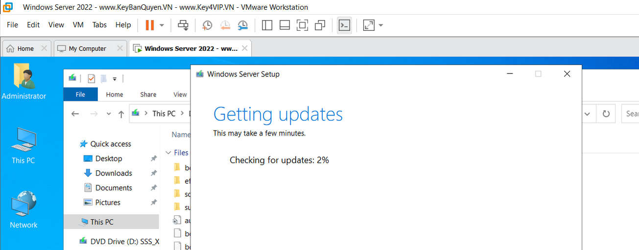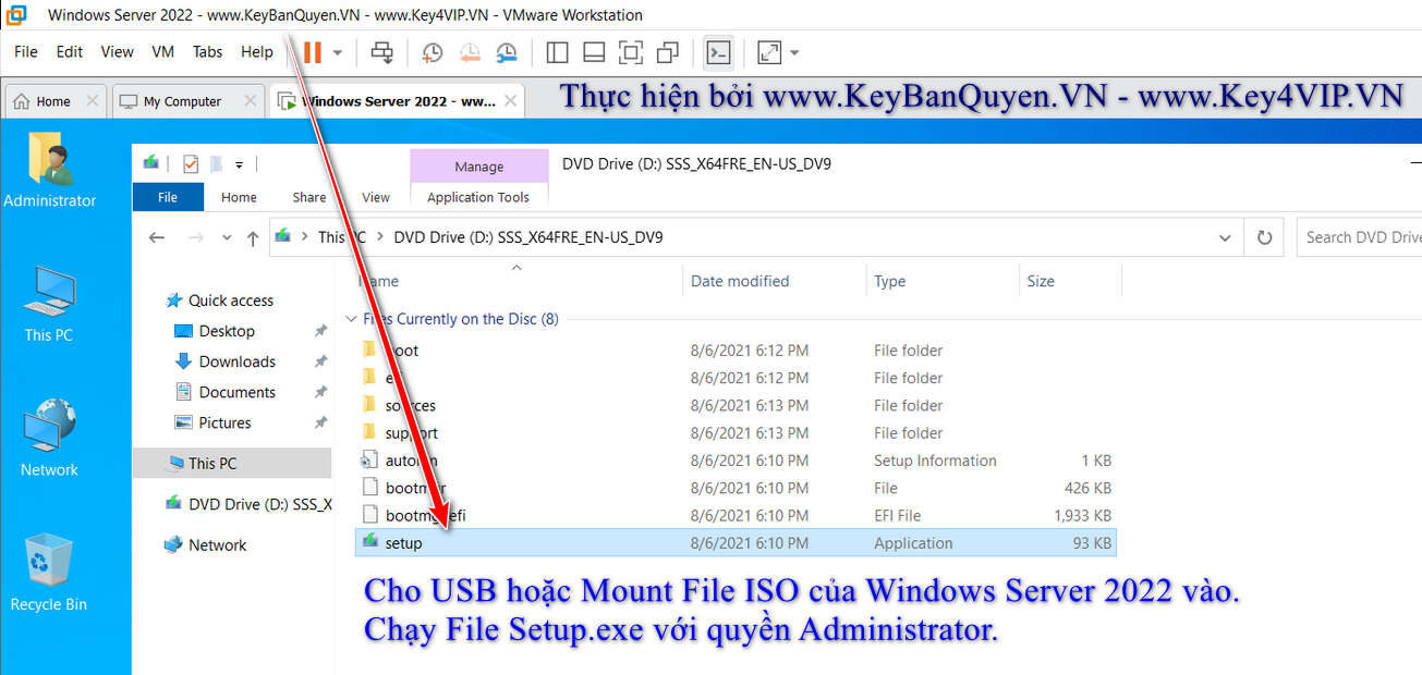Cho USB Boot vào hệ thống hoặc Mount file ISO của Windows Server 2022 vào và chạy File Setup.exe với quyền Administrator.