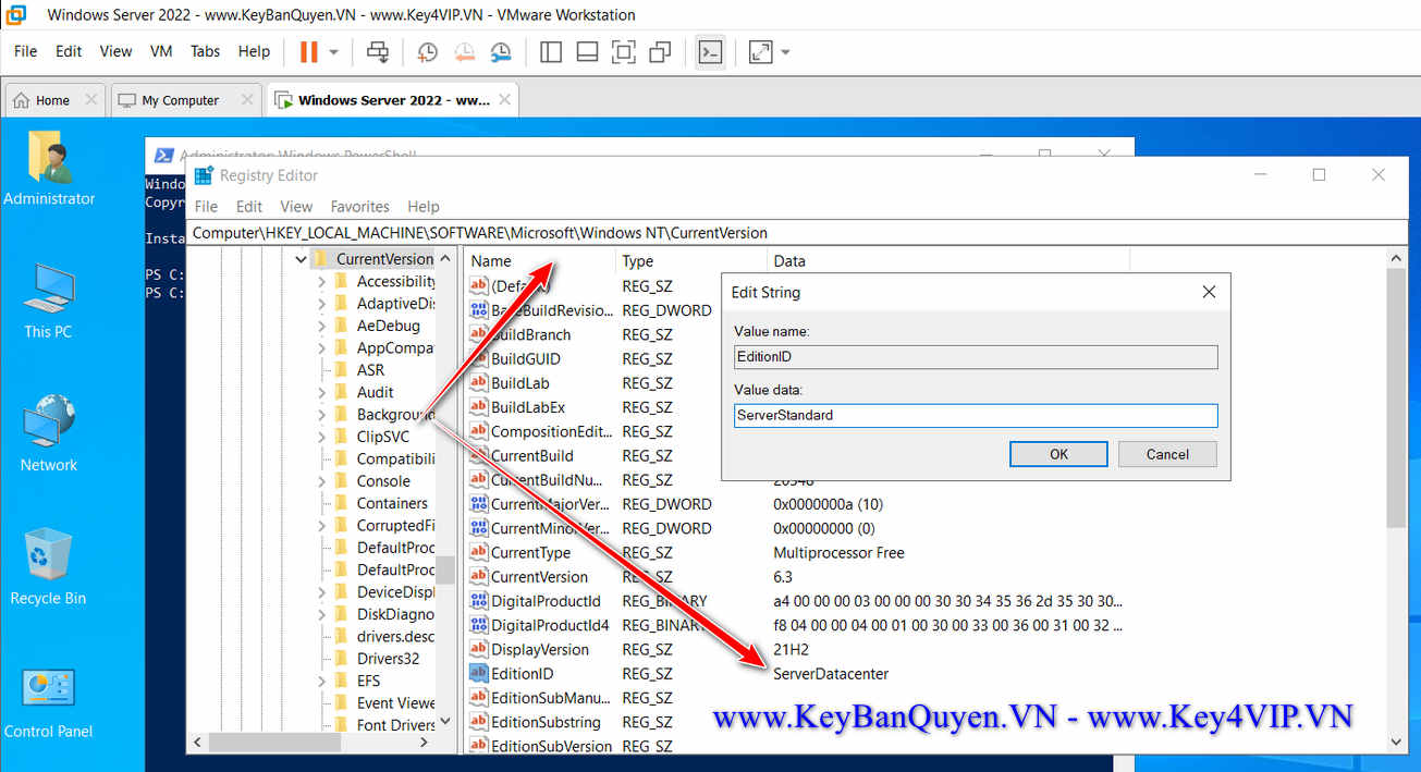 Bạn nháy đúp chuột vào mục Edition ID -> và thay ServerDatacenter thành ServerStandard .