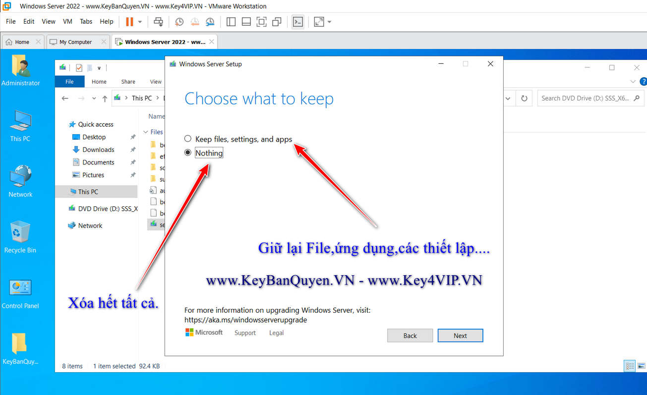 Còn tùy chọn : Keep files ,settting, and apps : Sẽ giúp ta không làm mất bất kỳ dữ liệu nào, các cài đặt, các phần mềm đã cài, các thiết lập cấu hình… NÓi chung là Server sẽ như là lúc chạy bản cao hơn.